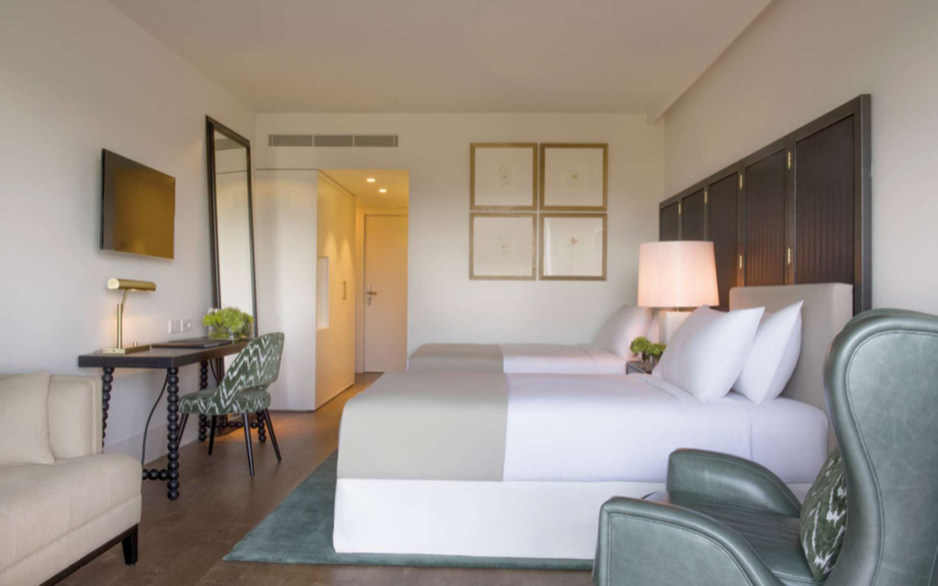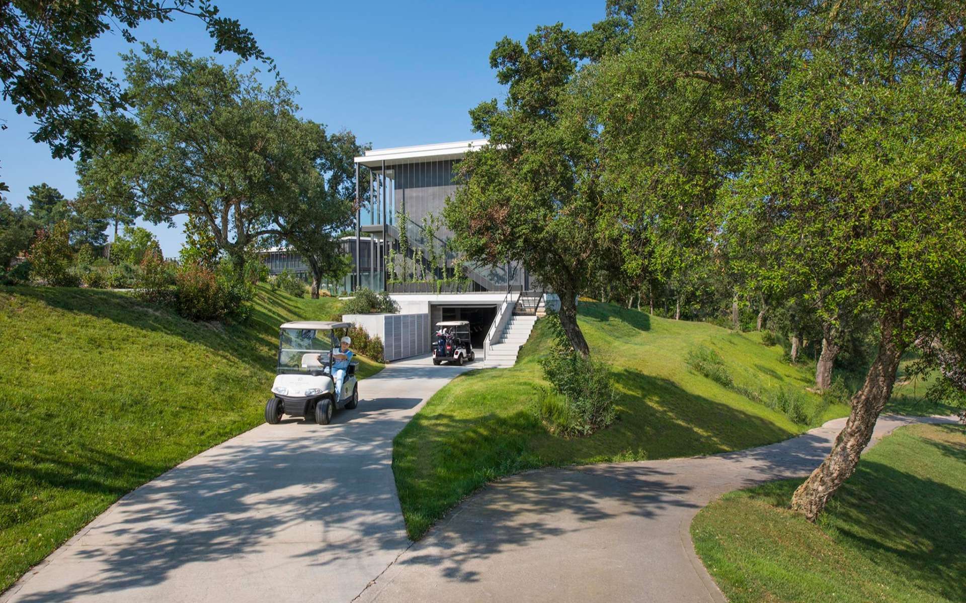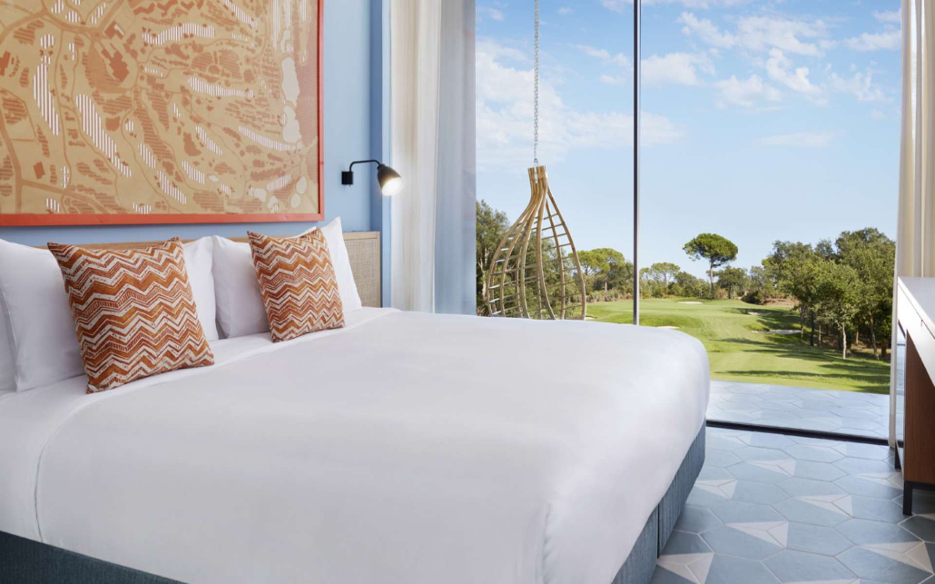 Ciascuna delle 50 camere è dotata di due letti singoli, un balcone con vista sul campo, una grande TV, Wi-Fi e un deposito per il golf progettato appositamente.